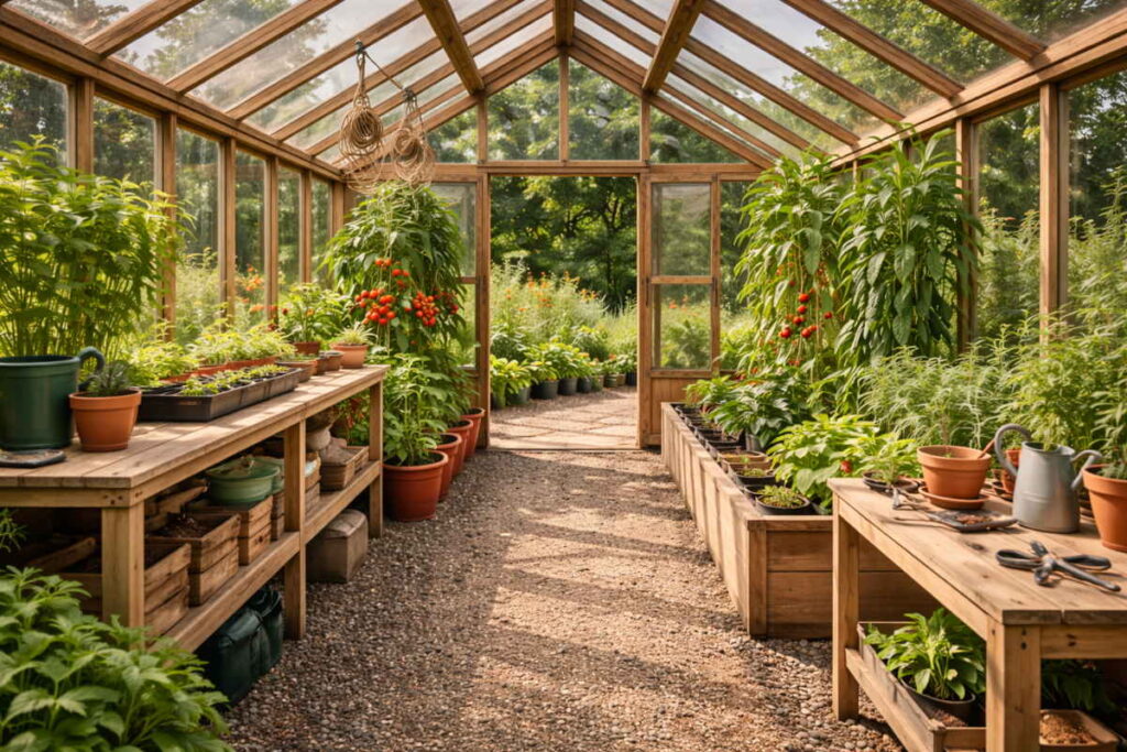 Indretning af drivhus handler om at skabe tydelige zoner. En zone til store planter, der står hele sommeren. En zone til forspiring og småplanter. En arbejdsplads, hvor du kan så, prikle og potte om uden at skulle rydde hele drivhuset først. Og ikke mindst et gangareal, der gør det let at bevæge sig rundt og passe planterne. Når du har zonerne på plads, bliver drivhuset et system, du kan gentage sæson efter sæson, uden at starte forfra hver gang.