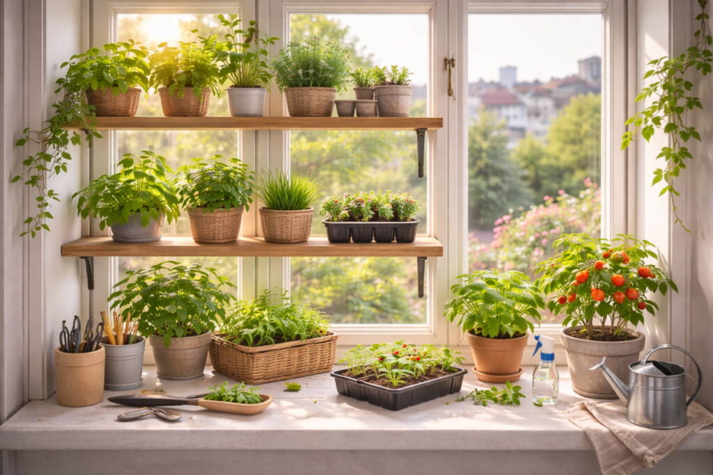 En vindueskarm-urtehave kan også bygges op som en lille “høstzone”. Sæt de urter, du bruger mest, tættest på der hvor du står mest, så de er lige ved hånden. Det gør det nemmere at få dem brugt, og det er ofte det, der gør forskellen mellem en vindueskarm, der bare er pynt, og en indendørs køkkenhave, der faktisk bliver en del af hverdagen.