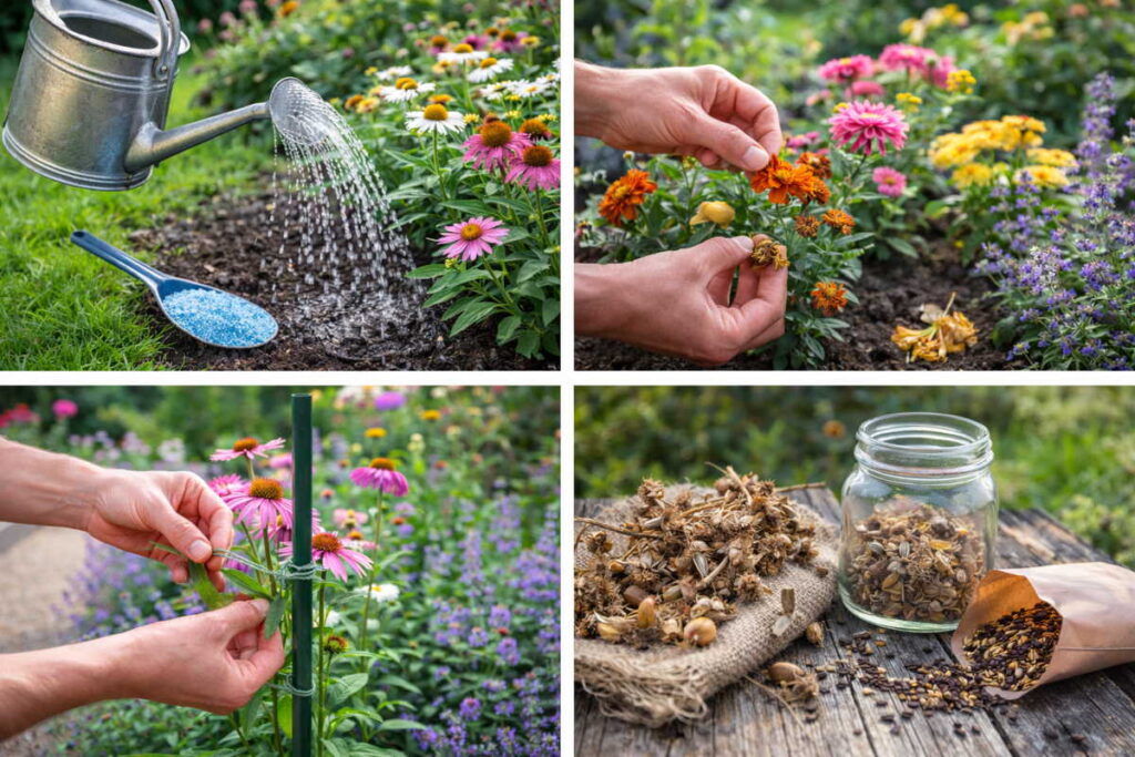 Lang blomstring kommer sjældent af én enkelt ting, men af en helhed, hvor planterne får stabile betingelser. Når du vander dybt i bede og gennemvander krukker korrekt, får du stærkere rødder og mere robust vækst. Når du gøder balanceret og i rette mængder, får du flere knopper og bedre farver uden at gøre planterne svage. Knibning og topning giver tættere planter, deadheading holder blomstringen i gang, og tidlig opbinding gør, at blomsterne står smukt gennem regn og blæst. Samtidig kan du holde stauder sunde i mange år med klog nedklipning og deling, og du kan udvide haven ved at gemme frø fra dine bedste blomster.